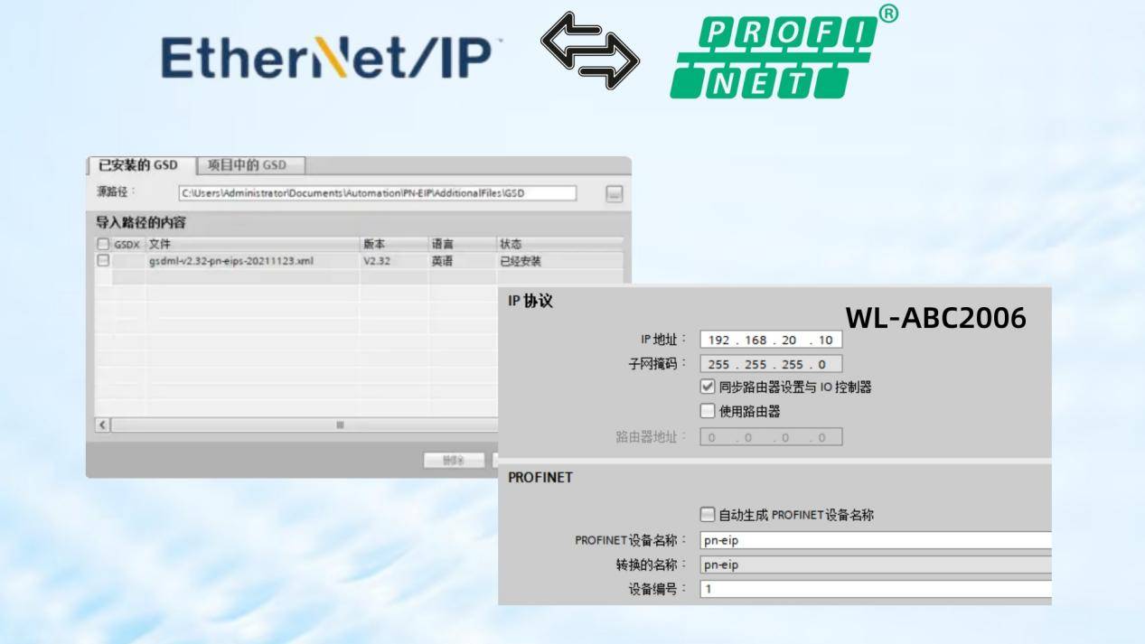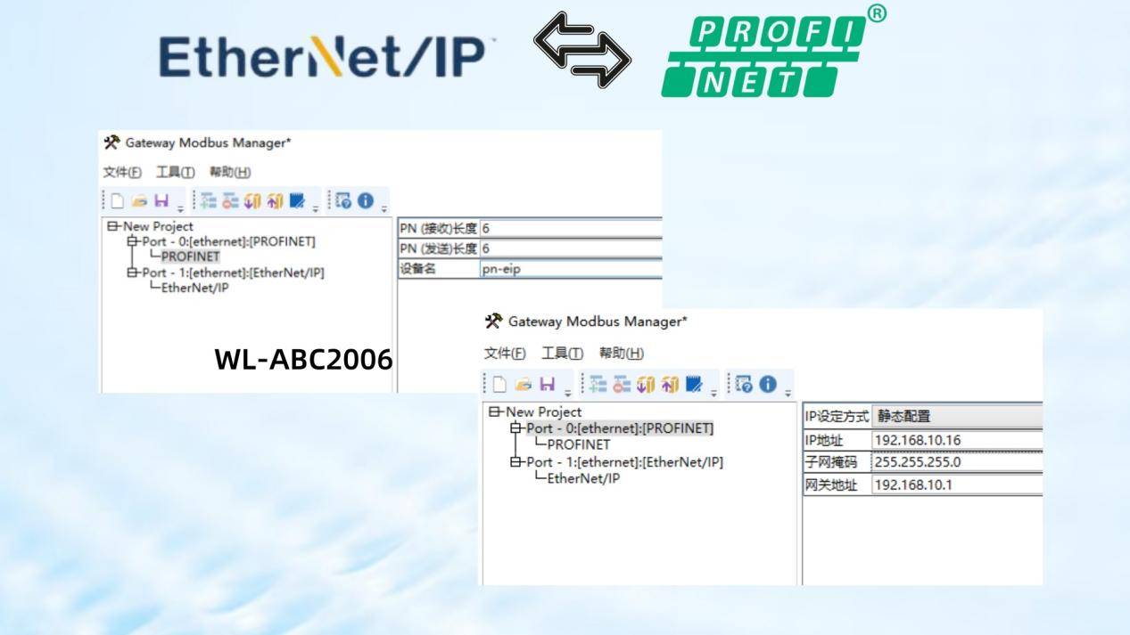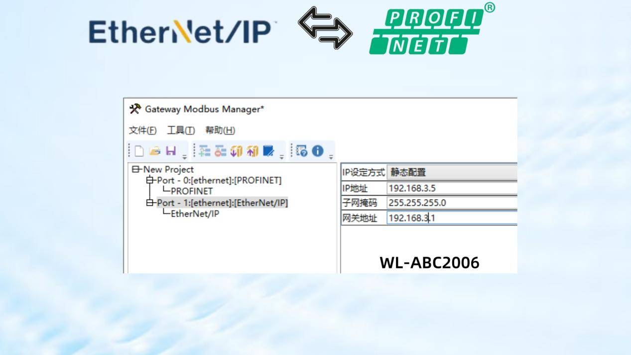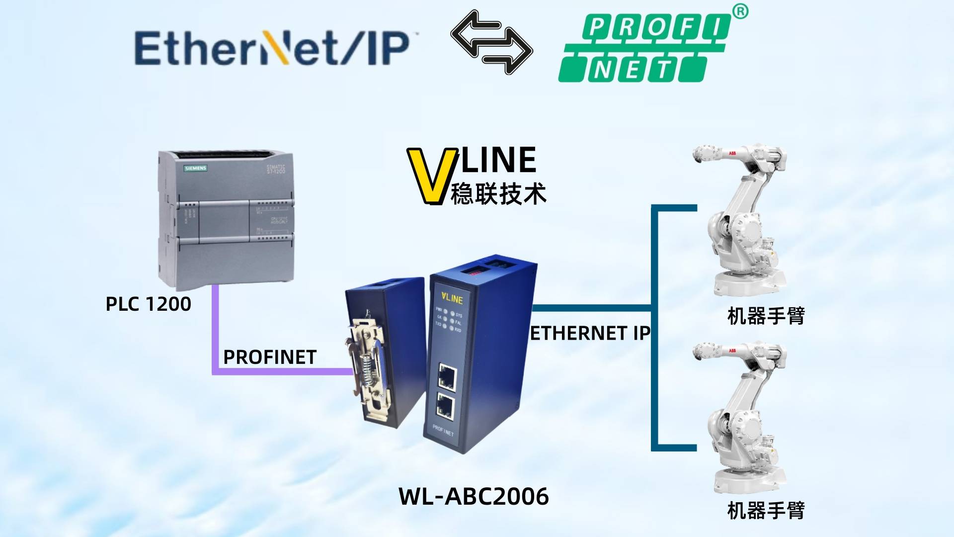 本案例呈现的是ABB机器手臂以Ethernet/IP主站的身份,与作为Ethernet从站的网关建立连接,而后网关将数据转换为Profinet协议,以供西门子PLC进行读写操作。