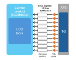 该传感器将东芝现有产品中外置的时序发生器电路[5]与CCD驱动电路[6]集成到该传感器中,从而减少驱动CCD所需的信号线数量,并省去了外部CCD驱动电路。同时,也无需对信号进行严格时序调整,简化布线工作并优化了系统开发流程。外部布线的减少有助于抑制高速运行期间产生的电磁干扰。