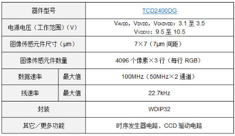 TCD2400DG是一款彩色CCD线性图像传感器,拥有三行图像阵列,每行4096个像素,像素间距为7μm。每一行分别独立识别红、绿、蓝(RGB)。其线速率(即每秒采集的行数)为22.7kHz,高于东芝目前用于图像检测设备的TCD2564DG(10.5kHz)。