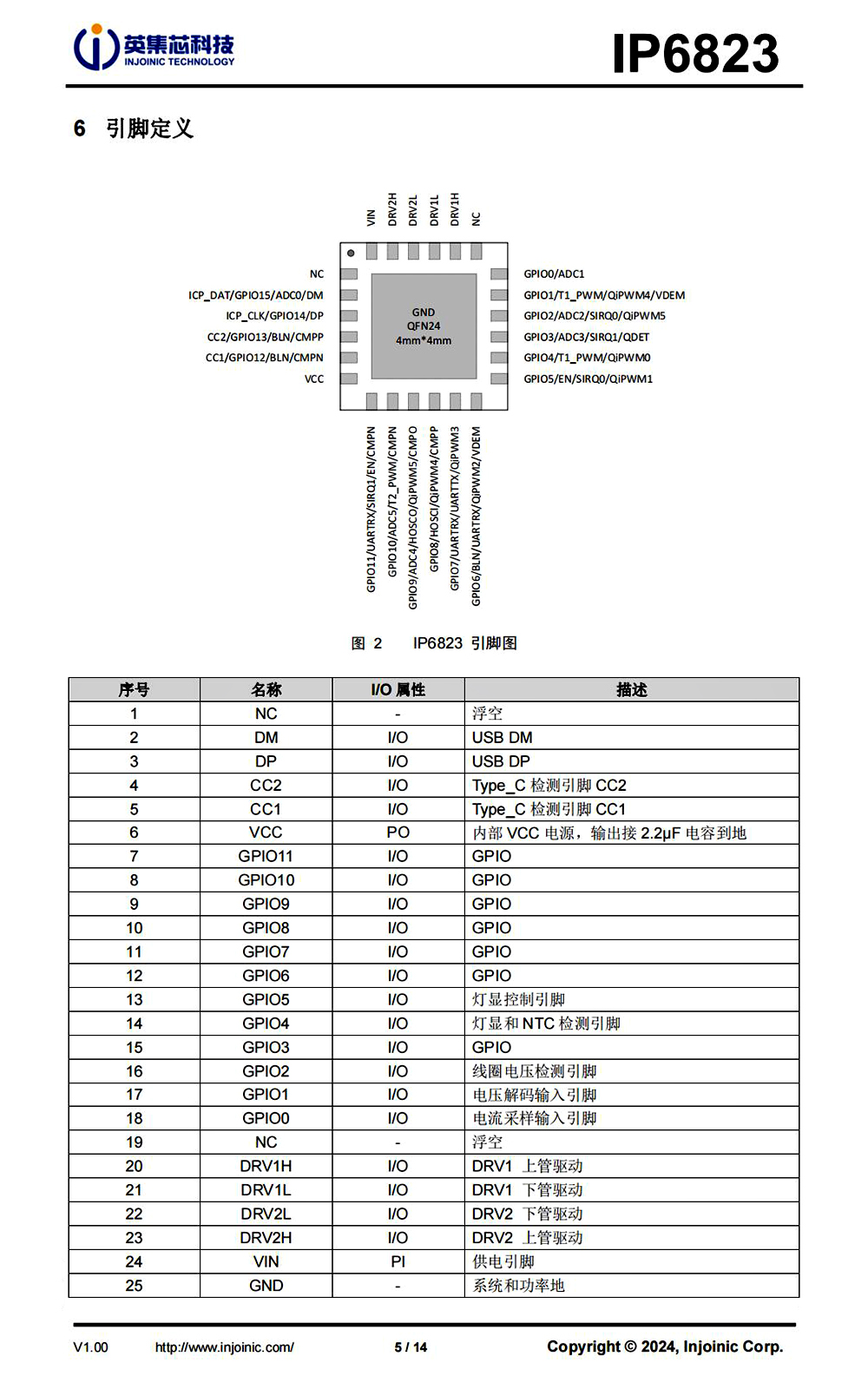 英集芯IP6823是一款用于智能手机、智能手表、智能音箱、车载充电器等便携设备提供无线充电方案的无线充电发射控制SOC芯片。符合WPC Qi标准,支持BPP、PPDE、EPP等多种协议。集成2P2N H桥驱动模块,外配全桥功率MOS,支持5W至15W功率输出。内置ASK通讯解调模块,支持线圈电压和电流的ASK信号解调与解码,实现QI无线充电协议。适配器快充Sink协议,支持DP&DM、PD3.0快充协议,支持5V/9V/12V电压档位。采用QFN24封装工艺,体积小巧,便于集成到紧凑型设备中。