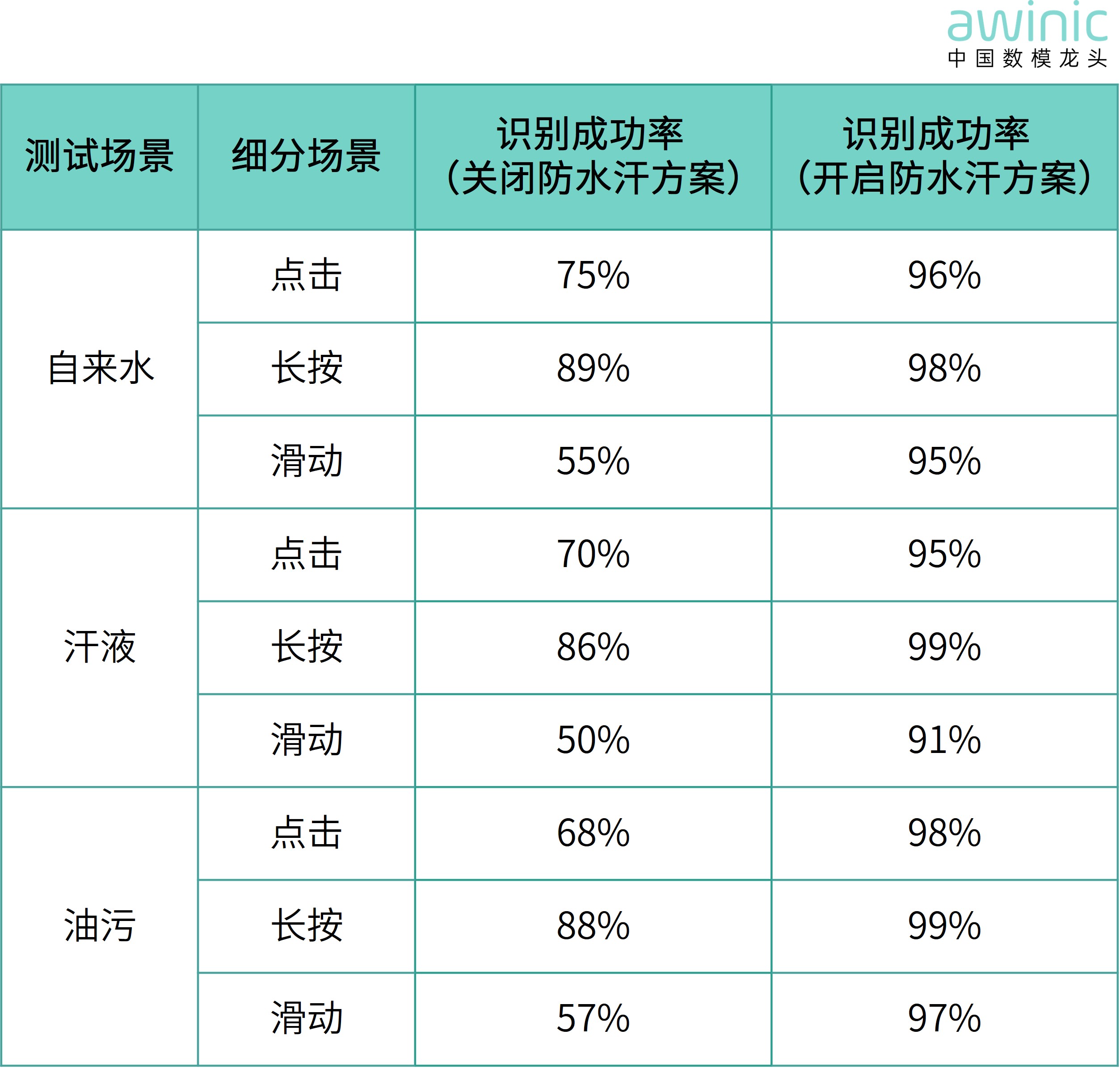 下表为典型场景下“大禹”防水防汗算法是否时,识别成功率对比测试。可见,开启“大禹”防水防汗算法,有助于显著提升抵御水汗、油污的性能,识别率提升10-40%以上;与市场上现有的量产方案相比,识别准确率高5-10%。