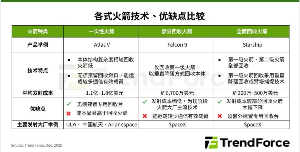 TrendForce集邦咨询表示,目前一次性火箭的平均发射成本落在1.1亿至1.8亿美元,部分回收则是6,700万美元左右。随着全球主要大厂积极发展可回收技术,目标在达成全面回收的情况下,有望将发射成本降低至200万至500万美元。