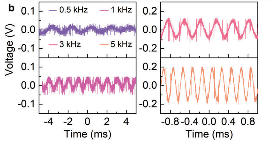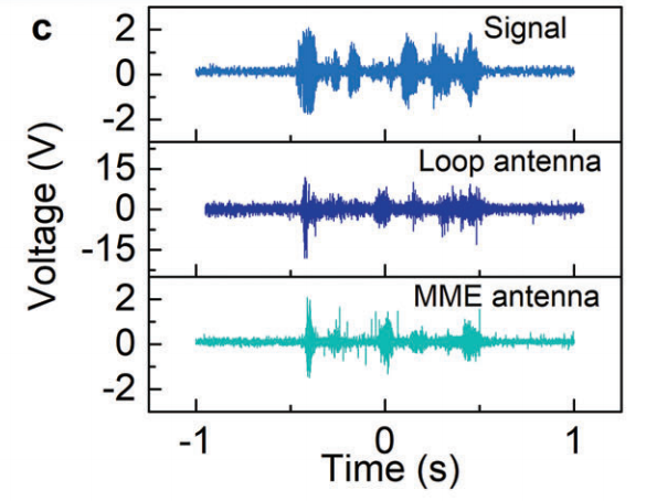 实验结果:由模拟音频信号“这是个磁电天线”转换而成的电压模拟信号,经过放大后分别输入到磁-机械-电耦合天线和环天线中。接收到的由磁-机械-电耦合天线产生的模拟信号相较于环天线产生的信号,背景噪音更低,还原度更高,更加接近原始语音电压模拟信号。此外,接收到的信号经过放大后可以直接输入到扬声器,播放出清晰的原始语音。