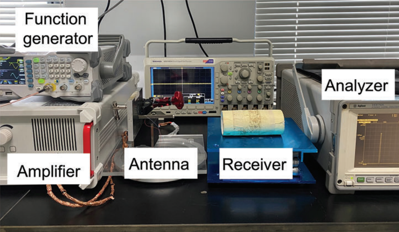 实验过程:利用信号发生器产生模拟音频信号,该信号通过ATA-3090功率放大器进行放大处理后,输入到磁-机械-电耦合天线中。天线将放大后的信号转化为电磁波信号并辐射出去。在接收端,使用接收线圈捕获电磁波信号,然后通过ATA-3090功率放大器进行再次放大处理,最终输入到示波器中。通过示波器可以观察到基本还原的模拟音频信号。此外,如果将放大后的接收信号直接输入到扬声器,可以播放出原始音频。