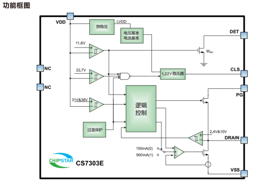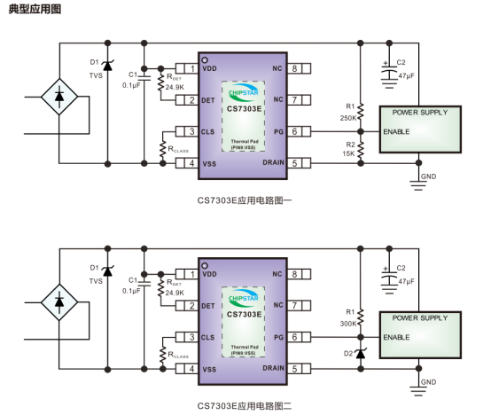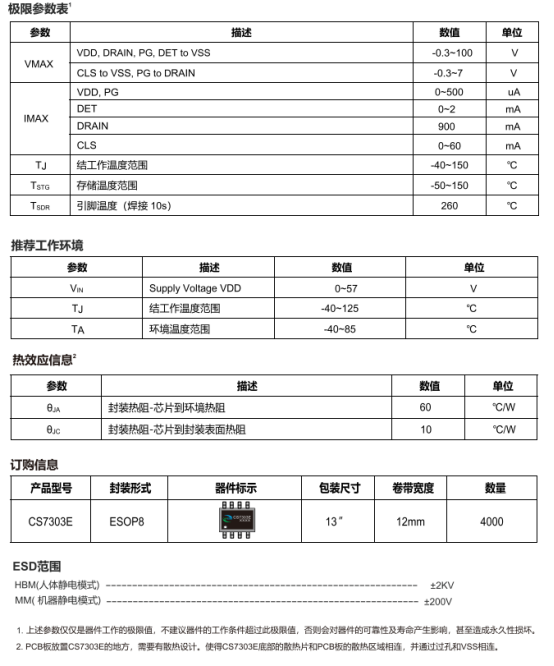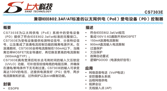 CS7303E是一款与SD4923E完全兼容的以太网供电(PoE)受电设备(PD)控制器,引脚定义、功能特性与外围配置全面匹配,无需修改PCB即可无缝替代SD4923E,适用于网络语音电话(VoIP)、安防摄像头系统、无线接入点(AP)、远程网络供电设备及视频会议终端等场景。芯片符合IEEE802.3af/at标准,输入电压范围0~57V,可承受高达100V电压冲击,集成100V 0.6Ω通路开关MOSFET,浪涌电流限制150mA,直流输入电流限制900mA(典型值),工作结温-40℃~125℃,环境温度-40℃~85℃,采用ESOP8封装,与SD4923E封装尺寸一致,安装兼容性拉满。
