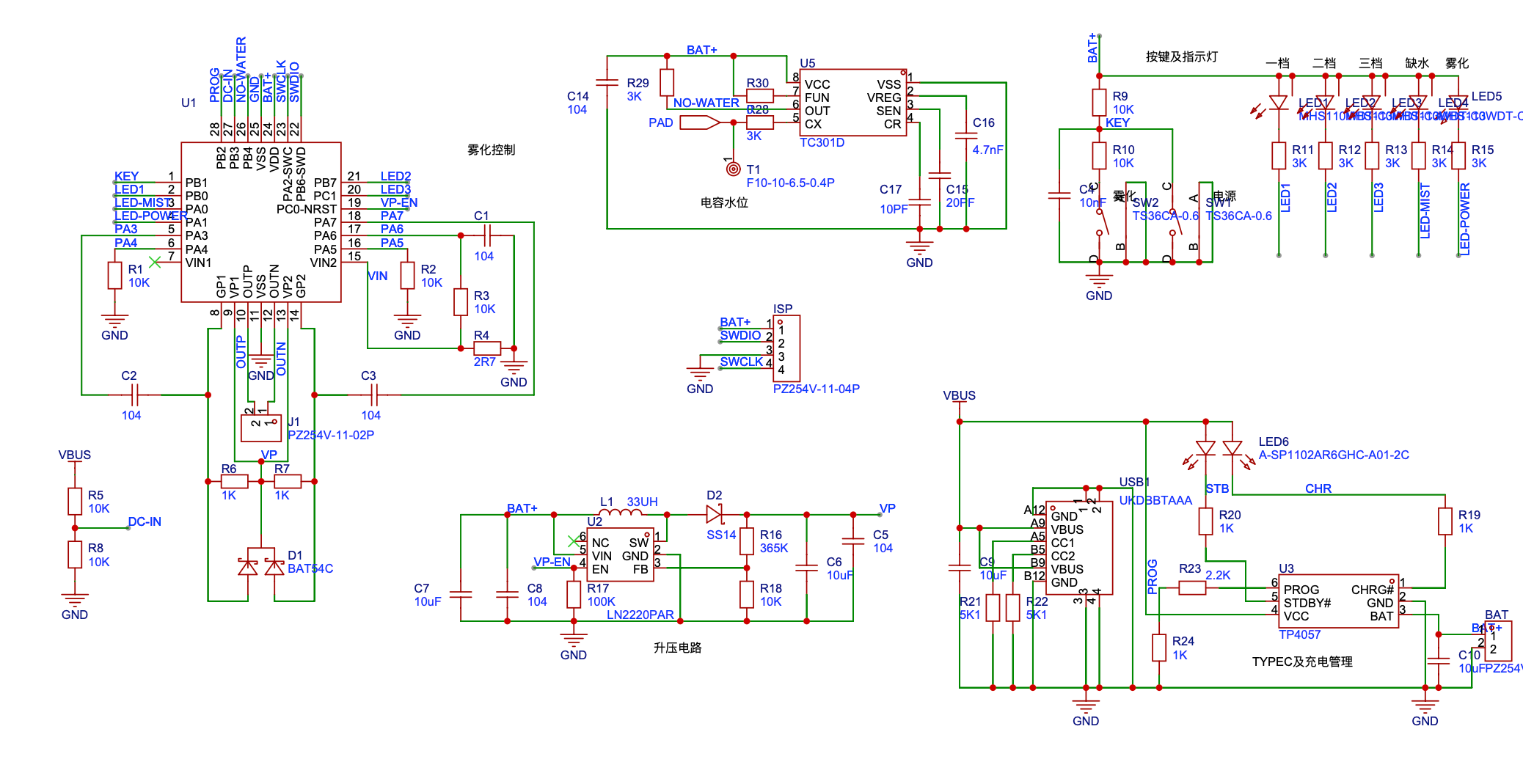 分享一个最新的便携微孔雾化装置的原理图,主要功能为驱动微孔雾化,兼具外围的升压和检水。