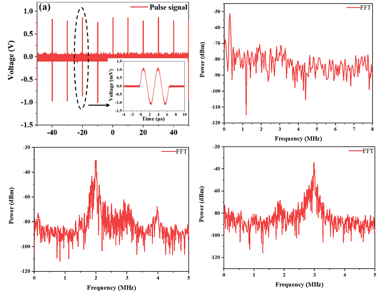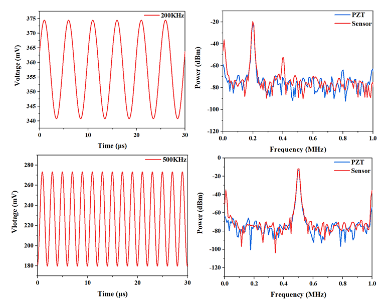 在300kHz、2MHz和3MHz连续超声信号下,传感结构的信噪比分别为41.8dB、66.5dB和61.7dB。在频率为300kHz、2MHz和3MHz的脉冲超声信号下,传感结构的信噪比分别为41.6dB、67.6dB和56.8dB。