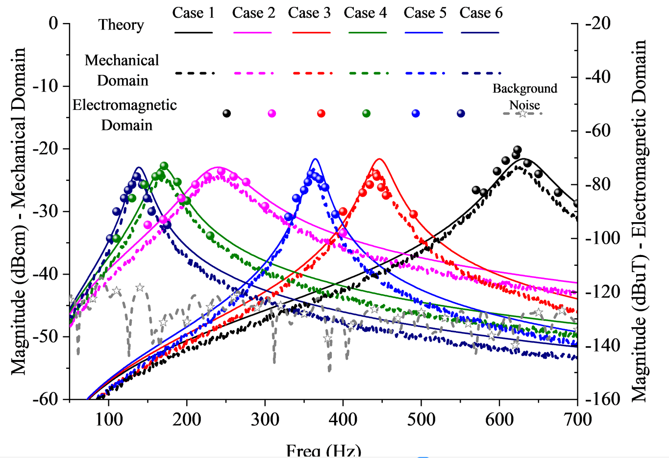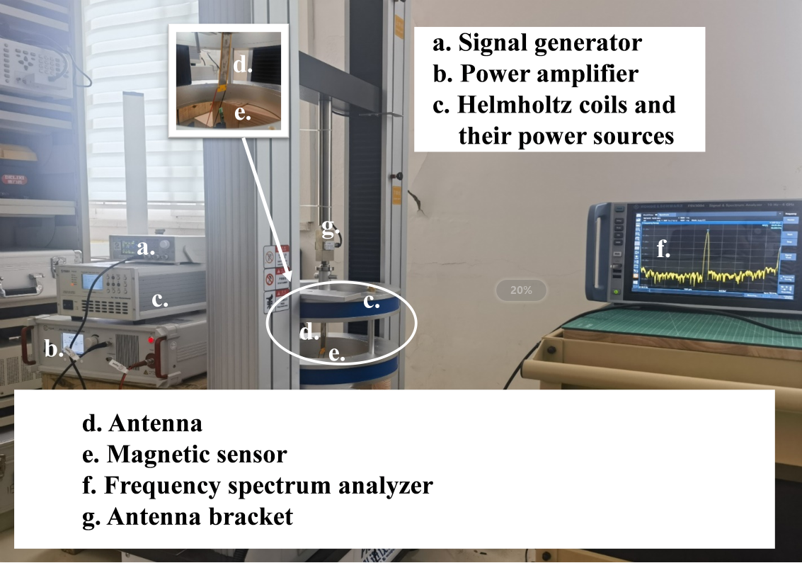 实验过程:信号发生器产生的扫频信号通过ATA-7010高压放大器传输到磁电天线的叉指电极膜上。基于压电效应,在亥姆霍兹线圈提供的磁偏压(60Oe)下,叉指电极薄膜上的电场通过PZT-5H压电陶瓷转换为机械波。然后,机械波驱动铁镓合金薄片,并根据压磁效应感应出与机械波频率相同的磁流。最后,磁流产生辐射磁场,并被距离天线0.9米的GMI磁传感器捕获。然后,磁传感器的信息被发送到频谱分析仪,从而获得磁电天线在电磁域的幅频响应特性和衰减特性。