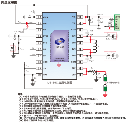 IU5186C是一款支持自动快充申请的全集成开关模式升降压充电管理IC,专为1~4节锂离子/锂聚合物电池及1~5节磷酸铁锂电池设计,适用于蓝牙音箱、电子烟、对讲机、锂电电池包及玩具等设备。芯片输入电压范围3.6~21V,最大充电电流3A(外部电阻可调),固定500KHz开关频率,工作结温-40℃~125℃,环境温度-40℃~85℃,采用TSSOP20-PP封装,底部带散热片,需搭配PCB散热设计,保障高压大电流场景稳定运行。