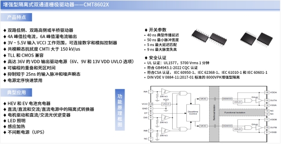 CMT8602x系列隔离驱动芯片被应用于MCU与功率器件(IGBT、MOSFET、SiC MOSFET)之间时,可实现低压控制侧与高压功率侧的电气安全隔离,规避噪声干扰,并有效放大控制信号以提供足够驱动电流,适配宽禁带半导体的高频开关需求,且其还集成了失效防护机制,可实时保护光伏系统的高效、可靠运行。