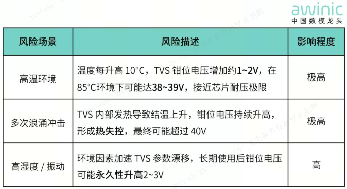 即使单次浪涌未击穿芯片,长期承受接近 40V 的电压波动会导致芯片内部绝缘退化,寿命缩短50% 以上TVS 在多次浪涌后可能性能退化,漏电流上升,钳位特性恶化,进一步降低保护效果