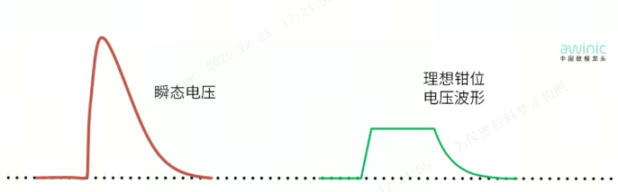 理想钳位电压与实际分立器件TVS钳位效果在钳位电压曲线上存在一些差异,下图是理想钳位电压在遭遇瞬态浪涌时的效果: