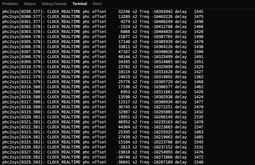 此外,影响时间同步精度另一个指标就是时间偏移量,即系统时钟(CLOCK_REALTIME)与 PHC 硬件时钟时间差。经过实践开发,可以看到offset(单位:ns)的最大值约为 48147 ns(≈48 μs),最小值约为 - 36840 ns(≈-37 μs),整体波动范围约为 85 μs(48 μs - (-37 μs)),偏移量的绝对值未超过 50 μs。一般系统时钟与 PHC 的偏移控制在百微秒内即满足多传感器同步需求,因此时间偏移量满足需求。