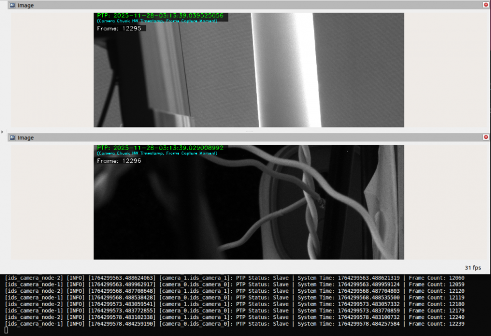 为了进一步呈现硬件时间同步效果,在测试过程中,我们将每帧时间戳叠加在该张图像上。采用多网口同步架构后,两个相机启动后,均能实现PTP硬件时间同步。随着时间增加Frame计数也会累加,可以看出,在累计1.2W+帧后,可以观察到PTP时间同步依旧稳定。