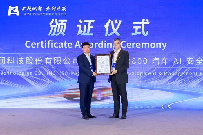 “产品千万类、安全第一位”,经纬恒润成立至今,始终重视终端用户的安全,“安全第一”成为产品研发的宗旨。在汽车电子产品方面,经纬恒润于2019年通过ISO 26262功能安全流程认证,2023年通过ISO 21448预期功能安全流程认证,2024年通过ISO 21434 网络安全流程认证。本次通过ISO/PAS 8800 AI安全流程认证,证明无论是传统的电子/电气系统、还是基于AI技术的车辆功能,无论是功能不足和合理可预见误用,还是随机硬件失效和系统性失效,经纬恒润都已经建立了完备的研发和管理体系,以保护车辆的安全。