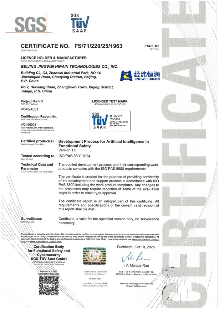 近日,北京经纬恒润科技股份有限公司(以下简称“经纬恒润”)通过了国际公认的测试、检验和认证机构SGS实施的ISO/PAS 8800:2024道路车辆AI安全流程认证,成为国内首个通过该认证的Tier1企业。