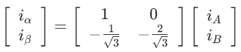 - Clarke 变换:将三相静止坐标系(ABC)的电流转换为两相静止坐标系(αβ),简化计算复杂度: