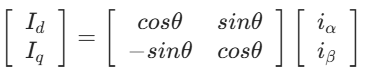 - Park 变换:将两相静止坐标系(αβ)的电流转换为两相旋转坐标系(dq),实现转矩与励磁解耦(θ 为 dq 轴与 αβ 轴的夹角,与电机转子位置同步):