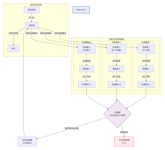 冗余设计:关键动力通道(如电机驱动器)的电流检测必须采用多重冗余设计(例如,双路或三路独立的电流传感器+处理通道),并进行实时交叉校验,确保单一传感器或电路故障时,系统能无缝切换或安全降级。
