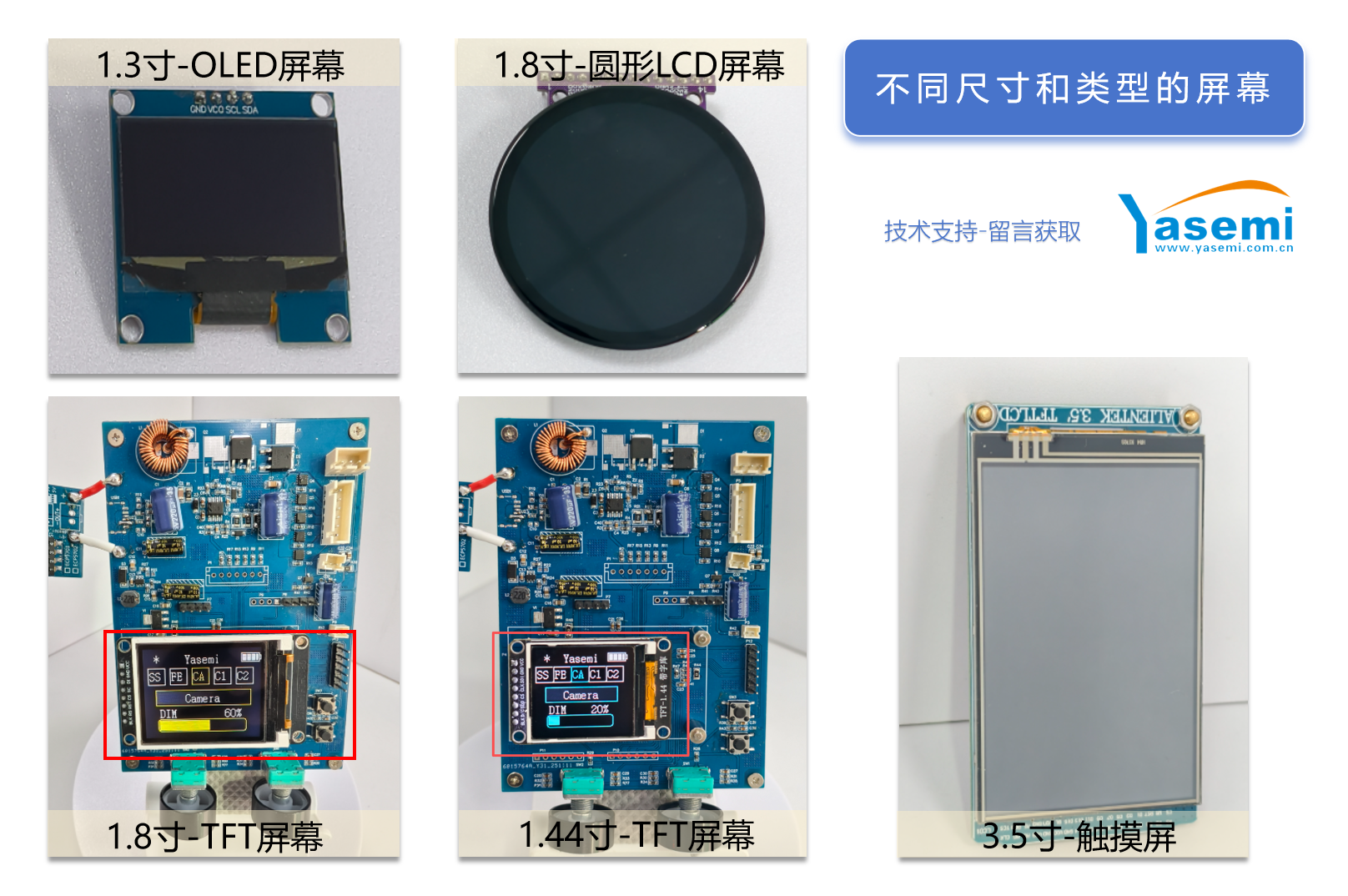 内置可扩展的屏幕参数库,涵盖主流尺寸与型号(包括1.3"–3.5" TFT/OLED/液晶屏及特殊圆形屏)。系统可自动识别屏幕类型,或通过简单配置选择加载对应参数,实现“零代码修改”切换屏幕。