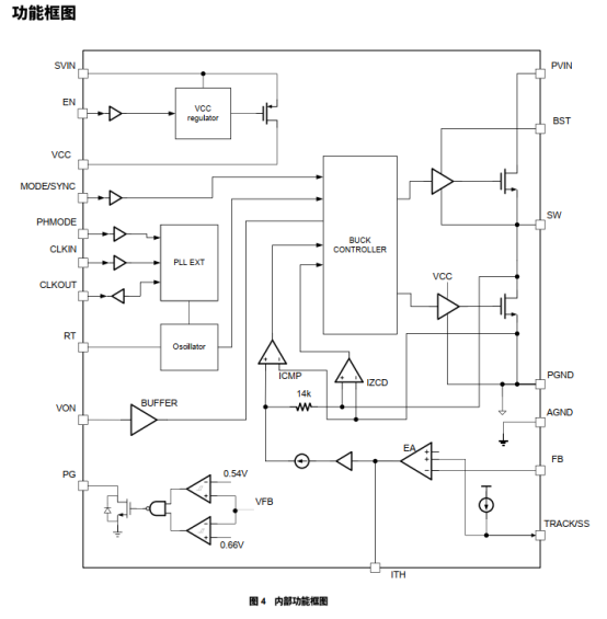 核心功能与LTC3633全面对齐,集成上下功率MOSFET(上管导通电阻57mΩ,下管35mΩ),开关频率可通过外部电阻在800kHz~2MHz范围内调节,也可与外部时钟同步,避免拍频噪声。支持0°/180°移相功能(通过PHMODE引脚控制),可多相交错并联扩展输出电流,满足大电流供电需求。输出电压通过外置分压电阻调节,基准电压0.6V(精度±1%),调节公式与LTC3633一致,兼容原电路电阻配置。