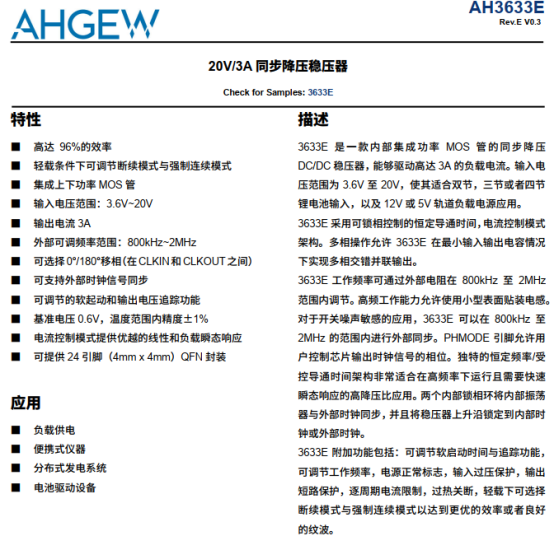 AH3633E/AH3633X是两款功能对标LTC3633的高集成度同步降压稳压器,核心性能、工作逻辑与应用场景高度匹配LTC3633,可作为其优选功能替代方案,适用于负载供电、便携式仪器、分布式发电系统及电池驱动设备。两款芯片输入电压范围3.6~20V,最大输出电流3A,工作结温-40℃~125℃,分别采用4mm×4mm QFN24(AH3633E)和2.5mm×2.5mm QFN18(AH3633X)封装,适配不同尺寸需求,安装灵活。