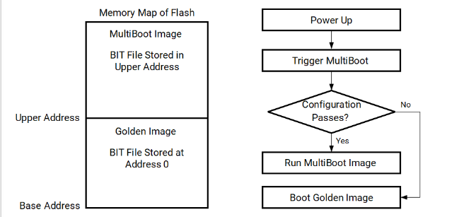 下图展示了 FPGA Multiboot 机制的整体配置与启动流程:FPGA 上电后默认从 Flash 0 地址加载 Golden Image,在满足触发条件后,通过 MultiBoot 机制尝试从 Upper Address 加载 MultiBoot Image。当配置成功时运行 MultiBoot Image;若配置失败,则触发 Fallback 机制,自动回退并重新加载 Golden Image,以保证系统仍可正常运行。