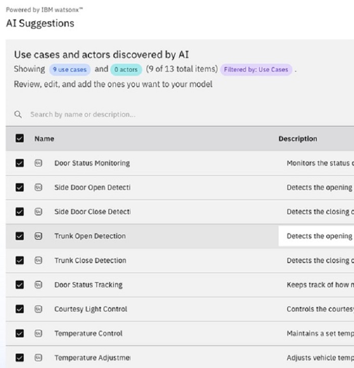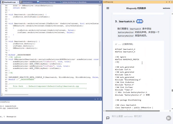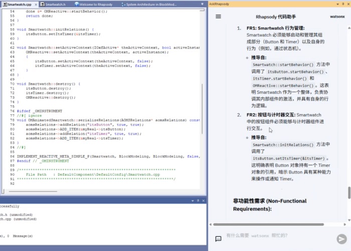 然而,随着系统日益“软件定义”,开发周期不断压缩,单纯依靠人工分析需求、建模、编写代码的方式已难以满足效率与质量要求。因此,IBM 为 Rhapsody 引入了一系列 AI 能力,旨在打造一个真正“懂工程”的智能伙伴。它不仅能理解自然语言需求并生成可导入的模型用例,还能作为代码助手协助理解、分析与生成代码,大幅提升研发效率与决策质量。
