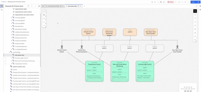 在传统流程中,需求分析师需要通读需求文档、识别参与者与场景、再手动创建用例图和交互逻辑。这不仅费时费力,也容易遗漏细节。而现在,工程师只需要上传需求文件,AI便能批量理解所有需求内容,智能识别其中包含的行为、交互、触发条件、系统反应等要素,并在 Rhapsody 中生成对应的用例描述与实体关联图。