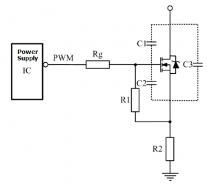 使用这种方法,我们应该注意几个参数及其影响。首先查看电源IC手册,了解最大峰值驱动电流,因为不同的IC芯片具有不同的驱动能力。其次,检查MOSFET的寄生电容,如图中的C1、C2和C3,如果容值较大,导通MOS管所需的能量也比较大。如果电源IC没有足够的峰值驱动电流,晶体管将以较慢的速度开启。如果驱动能力不足,上升沿可能会出现高频振荡,即使减小图1中的Rg也无法解决问题!而IC驱动能力、MOSFET寄生电容、MOSFET开关速度等因素,也会影响驱动电阻的选择,所以Rg不能无限减小。