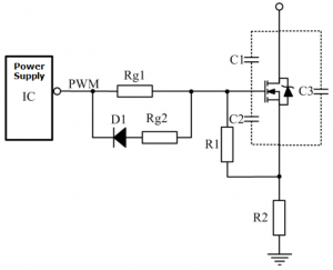 在关断的瞬间,驱动电路可以提供尽可能低阻抗的通路,使MOSFET的栅极和源极之间的电容快速放电,保证开关管可以快速关断。为了保证栅源极间电容C2的快速放电,在Rg1上并联了一个Rg2和一个二极管D1。其中D1通常采用快恢复二极管,缩短了关断时间并降低了关断损耗;Rg2的作用是防止电源IC在关断时因电流过大而烧坏。