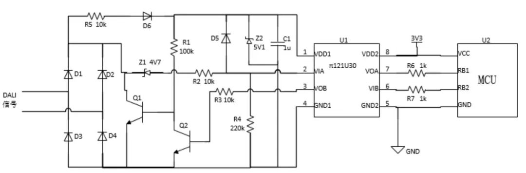 图3是采用数字隔离器π121U30设计的DALI电平转换电路。DALI信号整流后通过电阻R5和二极管D6给隔离器π121U30的VDD1供电。