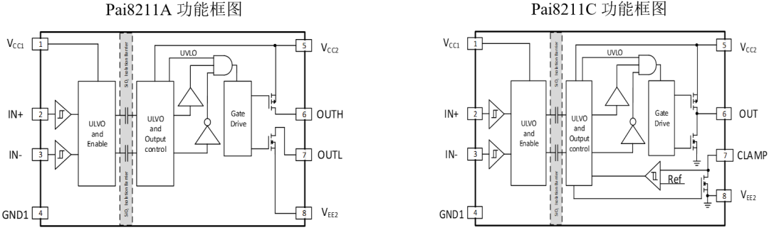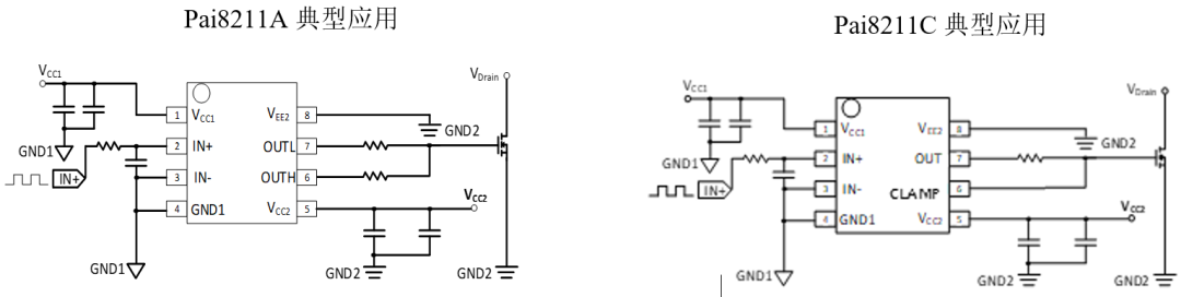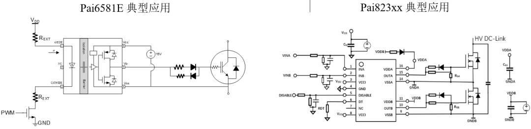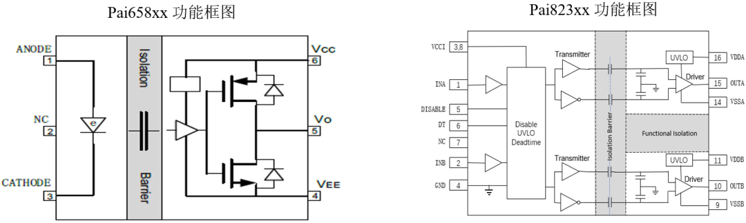 荣湃隔离驱动器产品单通道Pai8211x、Pai658xx和双通道Pai823xx的引脚定义及芯片内部框图如图2所示。Pai8211A和Pai823xx典型应用电路图如图3所示。