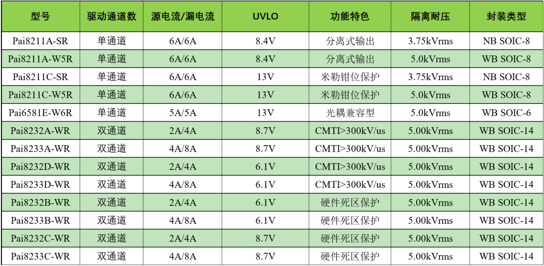 (注:表中●表示对应型号隔离驱动器包含对应的保护功能。)