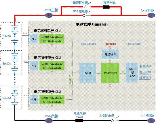 图2所示是集中式电池管理系统架构,所有AFE电池前端采集芯片、电池管理相关功能电路都集成在同一块电池管理控制器中。控制器分为低压区和高压区:低压区有微处理器MCU和非高压相关电路;高压区包含高压采样、电流采样和绝缘检测等与电池包电压、电流相关的处理电路。在早期的设计中,高压区也使用MCU,处理信号的同时与低压区MCU相互监控,以满足功能安全的要求。随着单芯片功能安全MCU的普及,高压区不再需要MCU,使用带数字通讯接口的ADC即可。高压区不管是使用MCU还是ADC,都需要使用支持SPI接口的数字隔离器进行通讯,荣湃四通道数字隔离器π141E60Q是满足此应用的车规级产品。