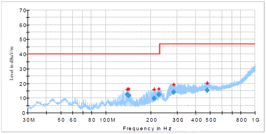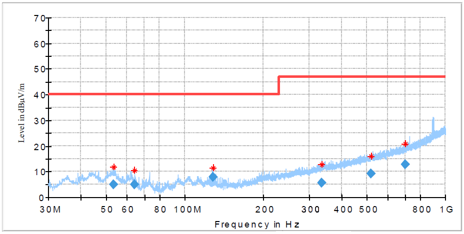 图4是参考CISPR 32:2015 Class B标准的荣湃四通道数字隔离器辐射发射(RE)测试结果。可以看到在30MHz~230MHz频段和230MHz~1GHz频段与超标限值相比都有很大的裕量。