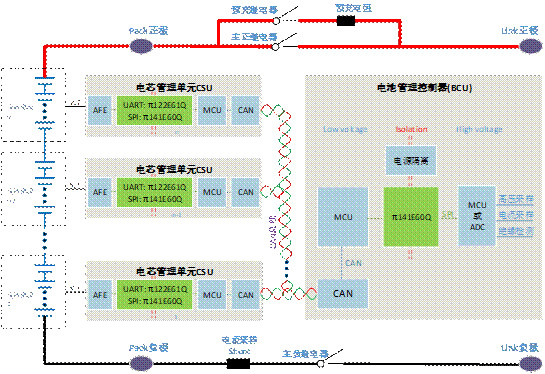 其缺点是成本较高,各CSU需要独立的CAN收发器配合额外的MCU与BCU进行通讯。虽然市面上已经出现了在BCU和CSU之间采用成本更低的菊花链通讯,但各个AFE电池前端采集芯片供应商提供的菊花链通讯都不兼容,并且稳定性方面也存在一定问题,如长距离通讯不稳定、BCI抗干扰能力较弱等。