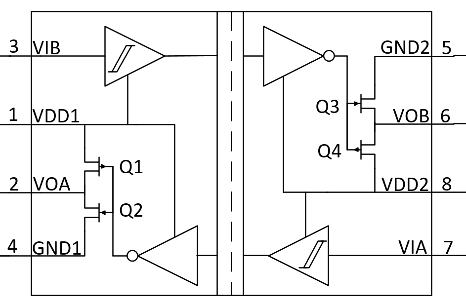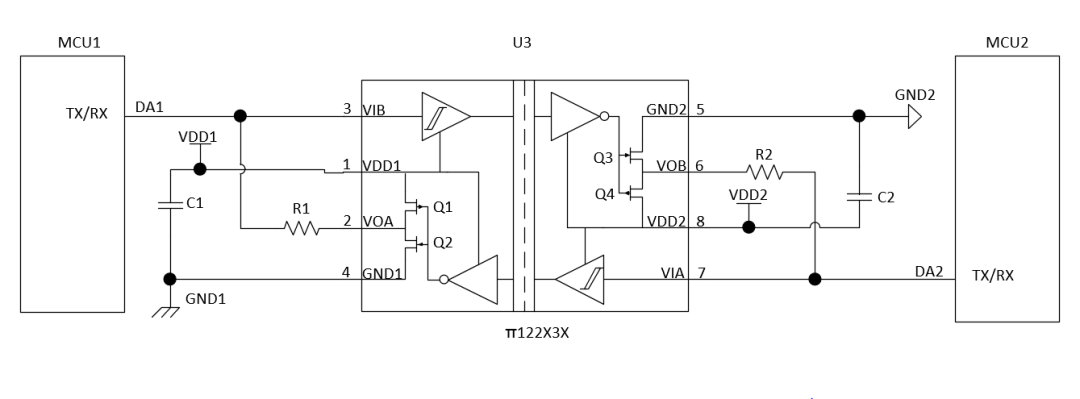 π1xx数字隔离器提供1-6路通道配置,1.5KV,3KV,5KV三种隔离耐压产品可供选择;具有宽温度范围(-40至125°C)内,150Kbps(U系列),10Mbps(M系列),200Mbps(E系列)的数据传输率,以及每通道约1.3mA的低功耗水平(仅是光耦功耗的1/5),十分适合用于功耗敏感的系统设计。π1xx系列产品强大的数字隔离架构,能够确保即使在恶劣环境中,例如在高电气噪声,高温,高数据传输速率下,依旧可以保持所传输信号的完整性。