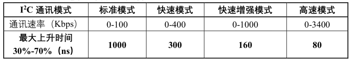 由于I2C接口为开漏输出,因此为了实现系统可靠运行,需要添加上拉电阻,如图3中R1~R4。上拉电阻影响信号上升时间与系统电流。上拉电阻过大会导致信号上升时间过大,导致不能正常通信。上拉电阻过小,会引起系统电流过大,损坏敏感器件。因此,需要根据需要选择合适的上拉电阻。由于上拉电阻与上升时间相关,不同I2C通讯速率规定了最大的上升时间,如表2所示。