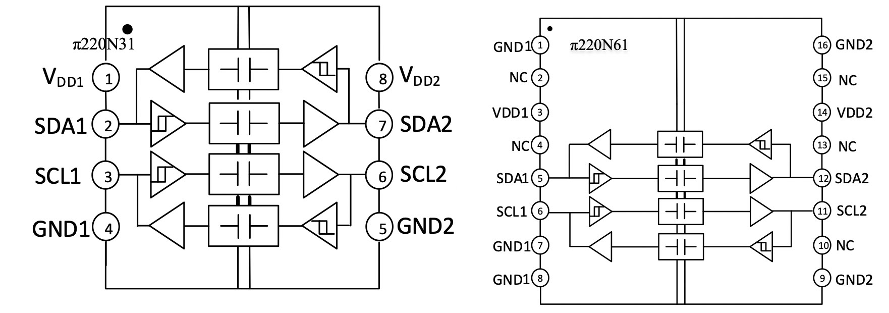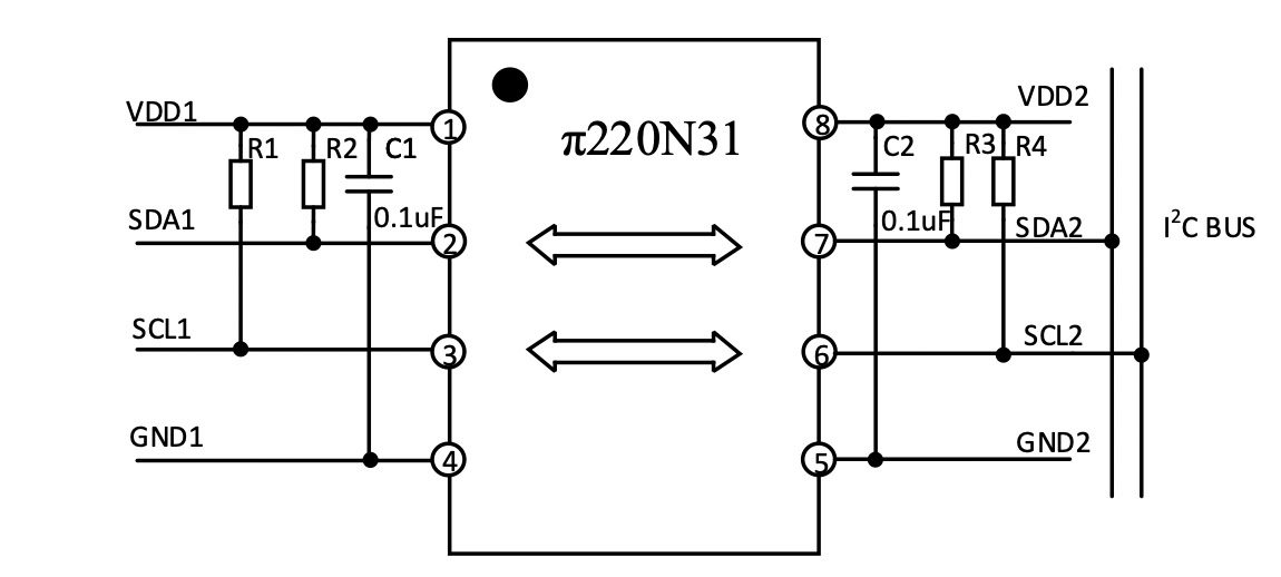 荣湃I2C隔离器热销产品π220N31和π220N61的引脚定义及芯片内部框图如图2所示,可兼容SCL单向产品π221N31和π221N61。π220N31典型应用电路图如图3所示。