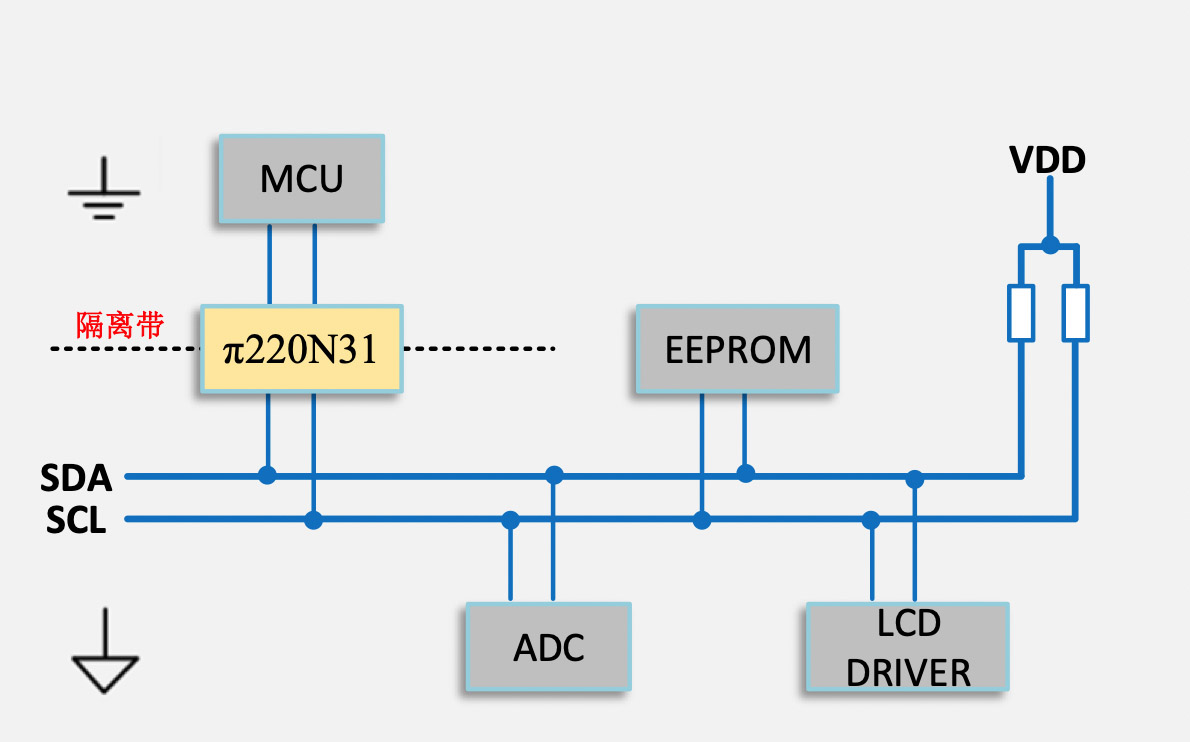 如图1所示,系统为了达到安全规范要求、避免噪声信号干扰通信、避免损坏敏感器件的目的,需要采用I2C隔离产品把器件之间的地隔离开来,例如荣湃I2C隔离产品π220N31。