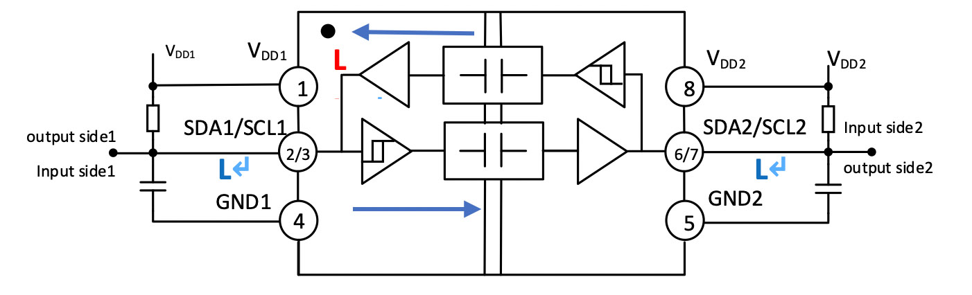 为了解决上述系统互锁为低电平的问题,隔离器1侧输出的低电平L'需要被芯片内部识别为高电平,才能不干扰外部通信。因此隔离器1侧输出低电平L'需要大于1侧输入阈值(阈值典型值为0.58V,因此要求输入电压小于0.45V)。同时隔离器1侧输出需要被外部器件(如MCU,ADC等)识别为低电平(CMOS为小于0.3VDD,TTL为小于0.8V)。因此1侧输出低电压0.58V<l'<0.8v,设定为0.7v,既不引起内部互锁,也能够被外部识别为低电平。< p="">