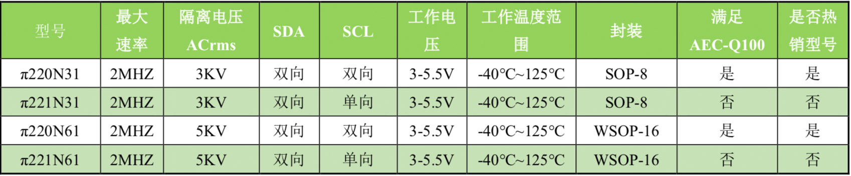 荣湃共有四款I2C隔离器产品,隔离耐压分为3KV和5KV两档,分别对应SOP8封装4mm爬电距离和WSOP16封装8mm爬电距离。串行时钟线SCL分为双向和单向两种。π220N31和π220N61为热销型号,并且满足AEC-Q100规范要求。四款产品具体参数如表1所示。