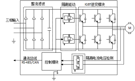 隔离器失效模式分类:隔离器为低电压系统提供一道抵御高电压干扰的屏障,同时实现高压系统与低压系统数据传输。如图1所示交流电机驱动系统,隔离的驱动器和隔离的电流电压检测器一方面实现数据传输,并把低电压部分控制模块参考地与高电压部分IGBT与电机系统参考地隔离开来。于此同时,避免了低压侧控制系统来自于高压系统的干扰,避免触电危险。