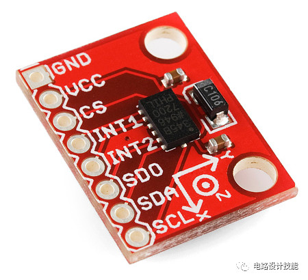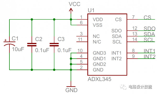 我们再来看一个实际的典型电路 - ADXL345是一颗加速度计传感器芯片,有两个分得比较开的电源管脚(Pin 1和Pin 6),在原理图中使用三个去耦电容来帮助降低传感器电压上的噪声 - 两个0.1μF的陶瓷电容和一个10μF的钽电解共同完成去耦功能。