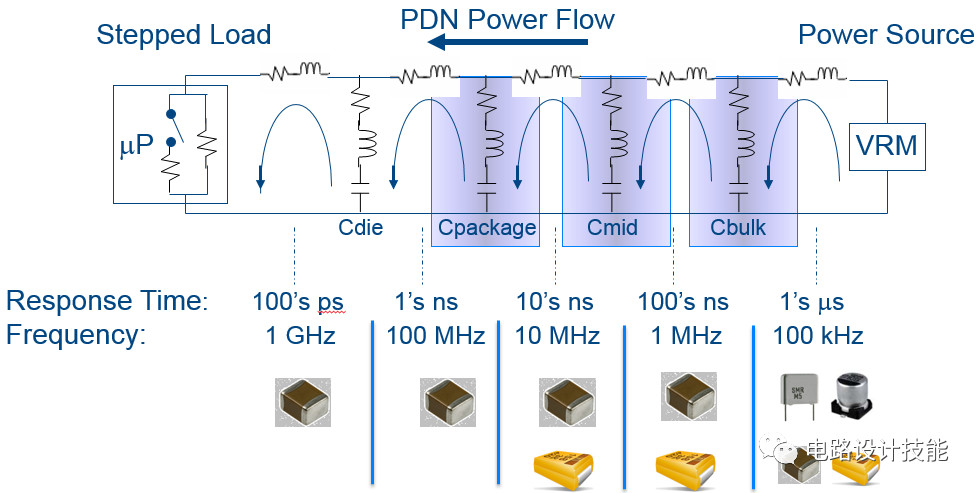 最后再回顾一下上一篇文章中我们的最后一个图,它是一个实际电子产品系统的供电分布网络(PDN - Power Distrubution Network)图,为了强调噪声的起源(最左侧),把电源模块(VRM)放到了最右侧。PCB上的走线、过孔、相关的器件引脚等都会产生寄生电阻、电感等,在图中以R+L的方式等效表达出来。在这个图中可以看出针对IC器件内部(Die)、针对整个IC器件(Package)、针对某一个功能模块中的电路单元都有相应的去耦电容,最左侧(靠近内核)采用频率响应很高的小容值、小封装的陶瓷电容,到右侧则是低频率、容量比较大的电解电容。