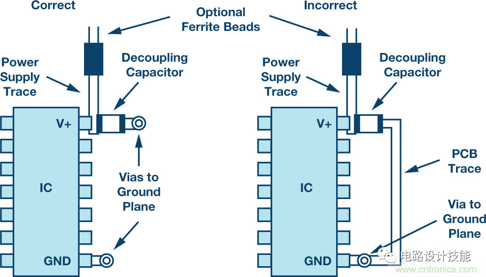 上图左侧,电源引脚和接地连接都比较短(直接通过过孔连接到内部地平面)是最有效的配置;上图右侧,PCB走线内的额外电感和电阻将造成去耦方案的有效性降低,且增加封闭环路可能造成干扰问题。