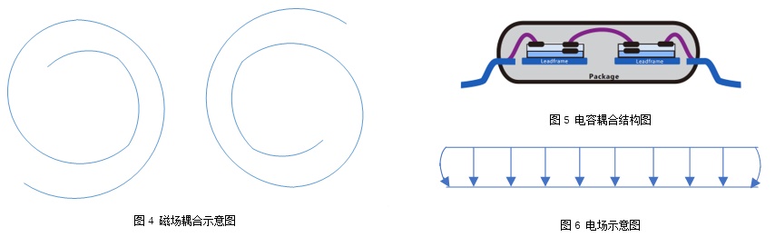 电容耦合技术就是在中间介质上采用一个不断变化的电场来传输信息。电容器极板之间的介质空间是一个极高耐压的电介质隔离器,形成数据非接触传输的隔离层。该极板尺寸、极板之间的间隔和电介质材料等决定着电气性能。在电容极板之间存在电场,电容上电压变化引起电场变化,在微观上表现为电容电荷的变化,这样就可以将交流信号传递到下一级。这就是电容耦合的机理,其本质是通过变化的电场来传递信号,通过电介质隔离层实现隔离。业界常称此技术为电容隔离,容隔,其本质就是电场耦合。电容耦合技术属于近距离信号传输,由于电场是封闭的,所以对周边环境辐射和干扰极小,如图6所示。电容耦合对磁场的抗扰度可以使其在饱和或高密度磁场环境下运行。