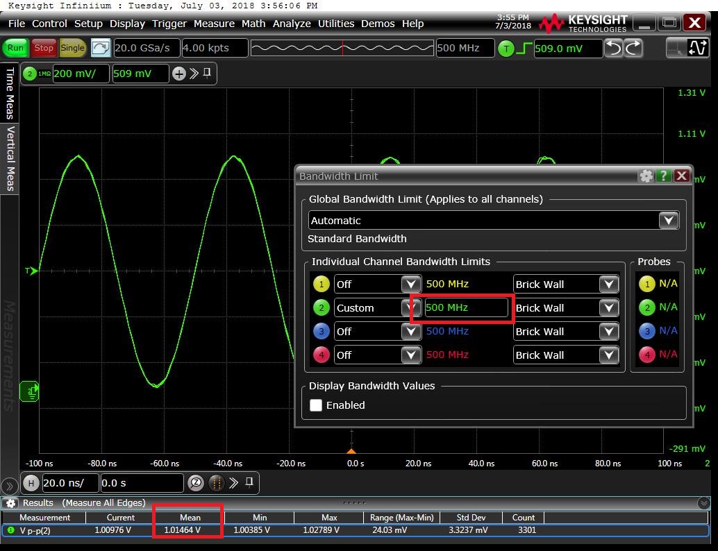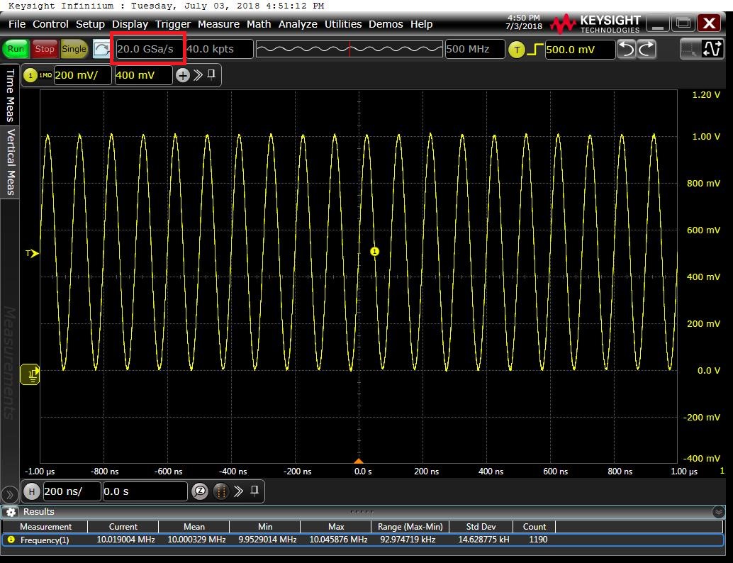 这里需要注意的是,-3dB是按信号功率计算的,相当于信号的功率增益下降了1/2,但示波器实际测量的是电压信号,功率与电压的平方成正比,所以-3dB相当于示波器电压的增益随着频率的增加下降到原来的0.707倍。如下图1所示,信号发生器产生了一个20MHz,1V峰峰值的正弦波信号,用500MHz带宽的示波器测量到的幅度是1V。