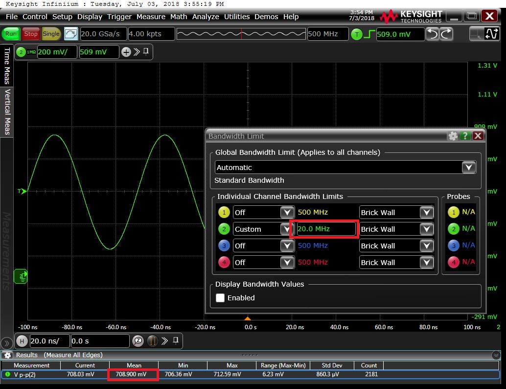 但当示波器的带宽限制到只有20MHz时,测量到信号的幅度为0.7V,如图2所示。